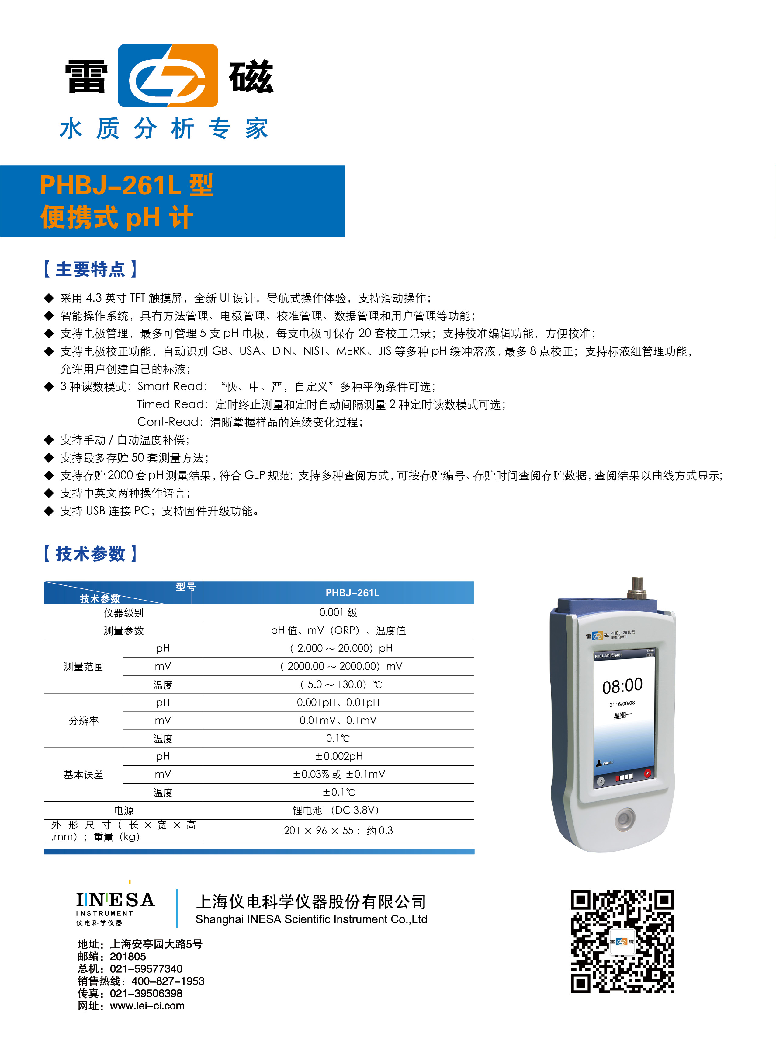 采用新型材料PC面板,輕觸數字式按鍵,可靠耐用;支持自動溫度補償,自動識別5種緩沖溶液,支持1-3點校準;支持USB連接PC、串口打印機;允許打印輸出測量結果。